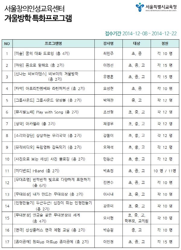 2015. 1. 7.(¼ö)ºÎÅÍ 1. 30.(±Ý)±îÁö ¿¹Á¤µÈ À̹ø ƯÈÇÁ·Î±×·¥Àº ÃÊ¡¤Áß¡¤°í ÇлýÀº ¹°·Ð Çкθð¿Í ±³Á÷¿ø±îÁö ´ë»óÀ¸·Î ÇÏ´Â ¸¹Àº ¹®È¿¹¼ú±â¹Ý ÇÁ·Î±×·¥ÀÌ ÁøÇàµË´Ï´Ù. ½Åû ±â°£Àº 12. 22(¿ù)±îÁö ¼±Âø¼øÀ¸·Î ¸¶°¨µË´Ï´Ù.